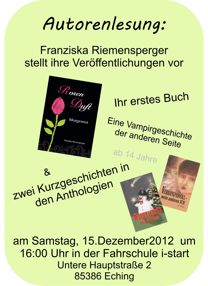 Ich möchte ganz herzlich zu meiner 1. Autorenlesung am Samstag, 15. Dezember 2012 um 16:00 Uhr in der Fahrschule i-start (Untere Hauptstraße 2, 85386 Eching) einladen.